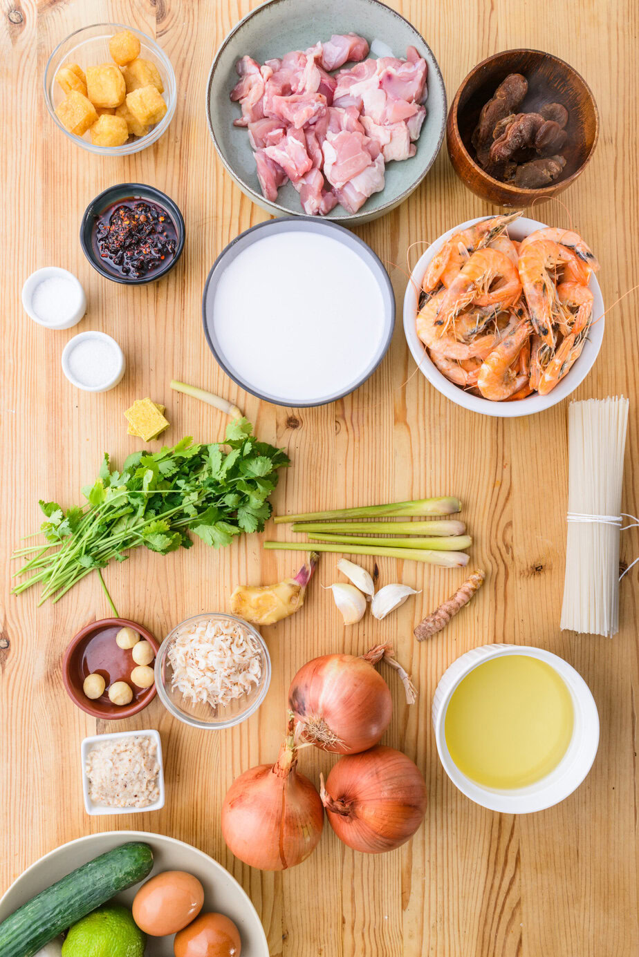 Un bouillon coco épicé garni de crevettes, poulet, nouilles de riz et herbes fraîches pour une laksa riche et parfumée.