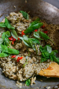 Côté texture, on vise des grains distincts, qui se tiennent et ne sont pas mouillés (khao ruan bpen met, grains séparés et intacts). L’essentiel, c’est l’impression initiale, basilic et citron makrut, suivie d’une bouchée qui évoque sans équivoque le curry vert, transposé pour le wok.