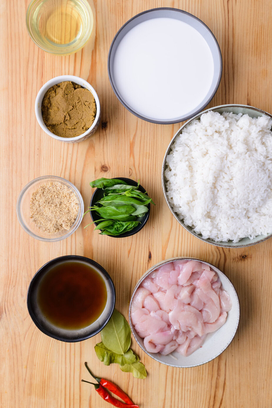 Une touche de lait de coco épais (crème de coco) apporte la matière grasse qui véhicule les aromatiques, aide la pâte à s’épanouir et vernit légèrement le riz, parfois cuite jusqu’à séparation de l’huile, ce qui intensifie la saveur. Certains cuisiniers thaïs préfèrent un style plus sec, avec peu ou pas de lait de coco ; d’autres visent une accroche à peine crémeuse. Dans tous les cas, le riz doit être enrobé, non mouillé ni aqueux.